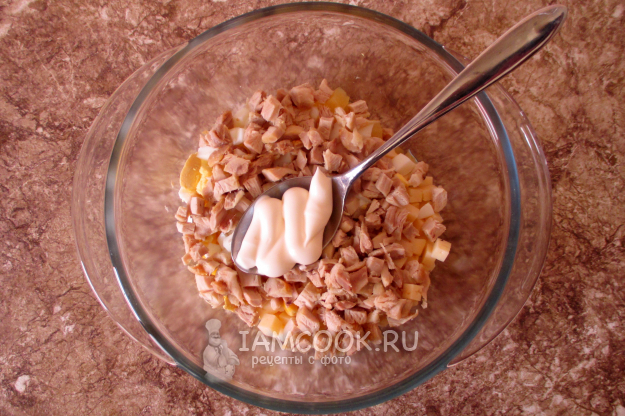 Если подача салата планируется не сразу, то заправьте майонезом перед подачей.