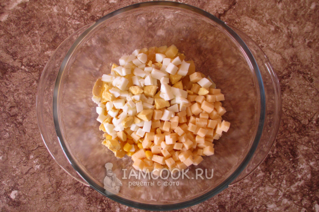 Аналогично нарежьте кубиком куриное мясо, добавьте его к остальным подготовленным ингредиентам и заправьте майонезом.