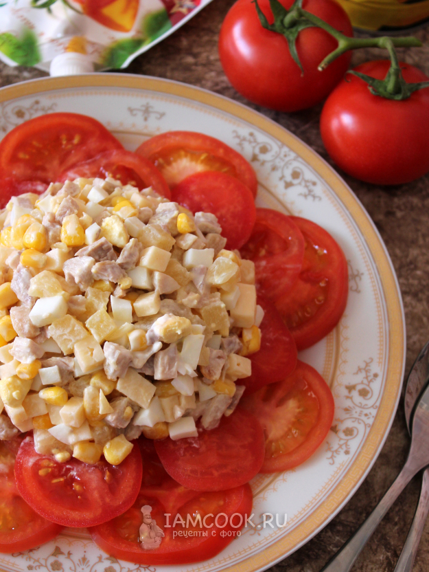 На плоское блюдо уложите по кругу ломтики помидоров, а посередине - сам салат. В идеале под ломтиками должен быть листовой салат, если он есть в наличии...