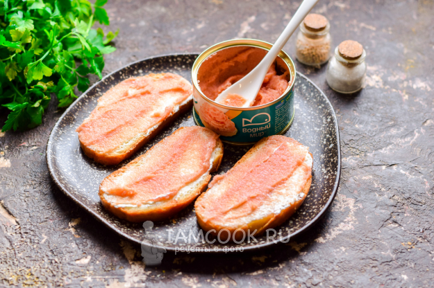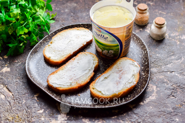 Смазать подрумяненные ломтики батона сливочным сыром.
