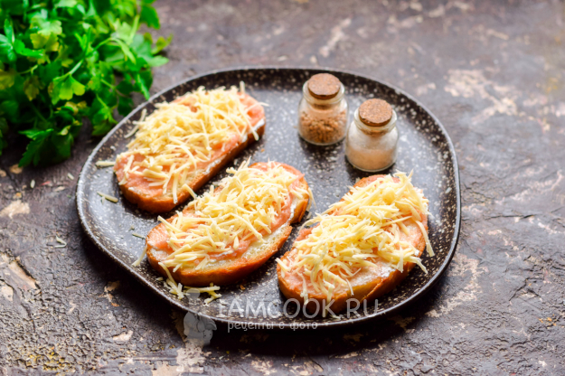 Твердый сыр натереть на мелкой терке, посыпать бутерброды.
