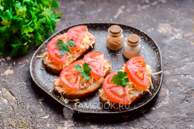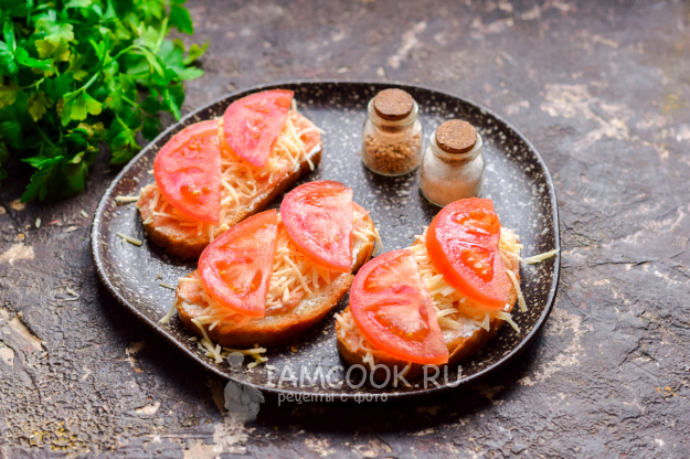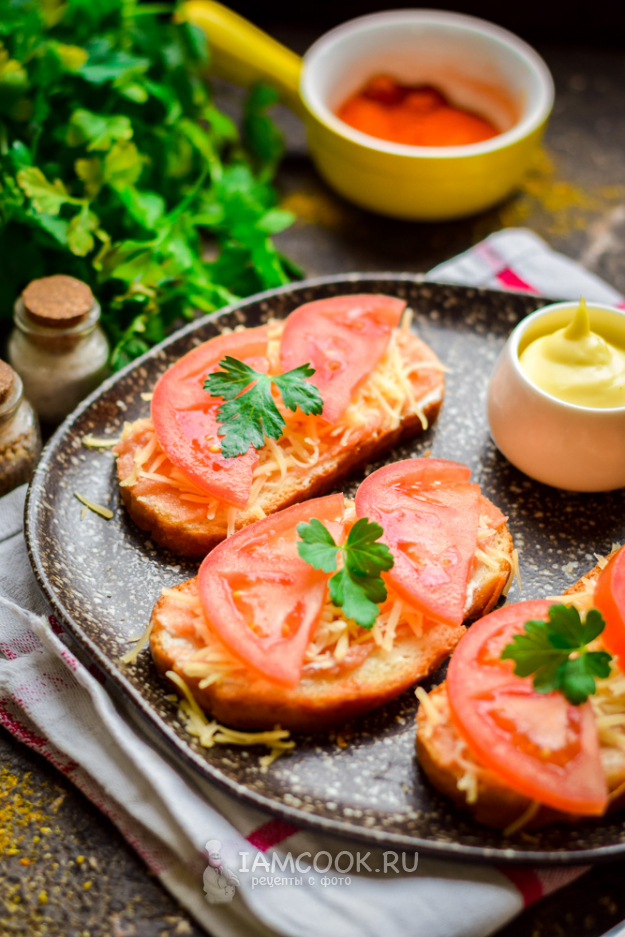 Помидор сполоснуть, просушить. Нарезать пластинами и уложить на бутерброды.