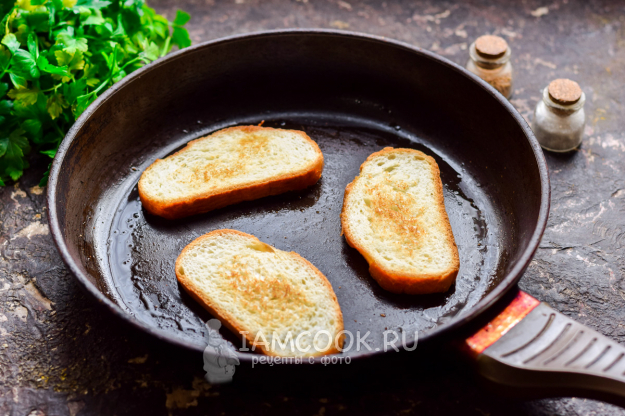 Смазать сковороду растительным маслом, хорошо разогреть. После переложить в сковороду ломтики батона, жарить несколько минут, до румяной корочки.