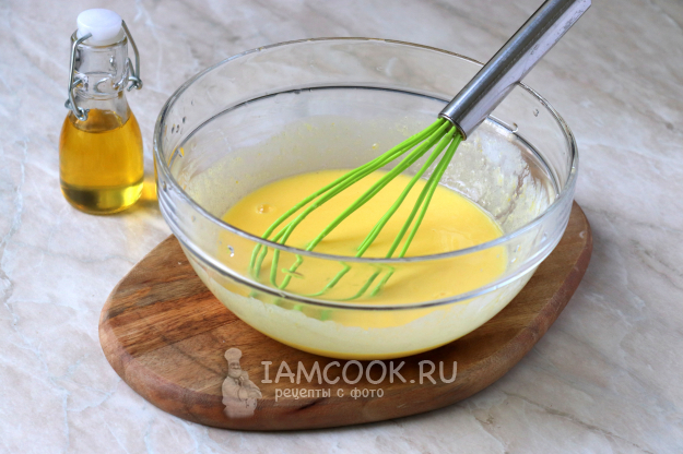 Затем в глубокой миске соедините тёплый кефир, сахарный песок и куриные яйца. Тщательно перемешайте.