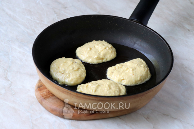По истечении времени отправьте сковороду с растительным маслом на огонь и хорошо прогрейте. Столовой ложкой выложите немного теста, формируя круглые или овальные заготовки.