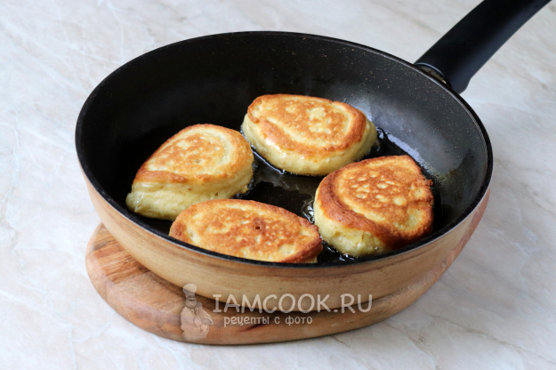 Жарьте оладьи на небольшом огне по 3-4 минуты с каждой стороны, до золотистого цвета. Они получаются очень пышными, поэтому следите, чтобы тесто пропеклось не только снаружи, но и внутри. Готовые оладьи переложите на бумажную салфетку, чтобы впиталось лишнее масло.