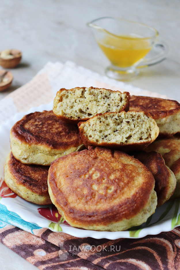 А подавать оладьи с орехами лучше всего с мёдом, вареньем или сгущённым молоком.