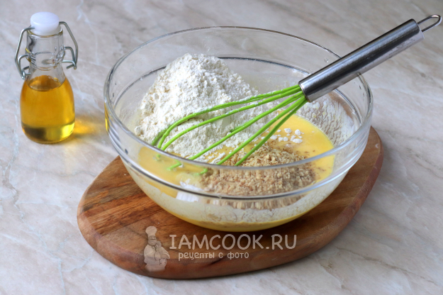 Добавьте измельчённые орехи, просеянную пшеничную муку и пищевую соду.
