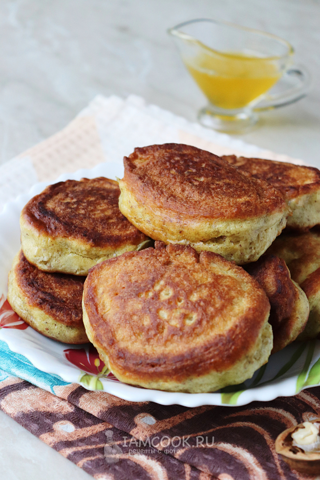 Вот и всё, очень вкусные оладьи с грецкими орехами, замешанные на кефире, можно подавать на стол.