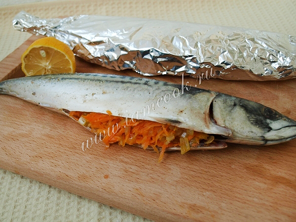 Скумбрию натираем лимонным соком внутри и снаружи, солим и перчим со всех сторон. В брюшко рыбы выкладываем лук с морковью и заворачиваем скумбрию в фольгу.