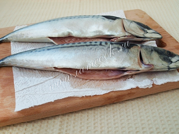 Рыбу хорошо моем, разрезаем и освобождаем от внутренностей, удаляем жабры. Затем промываем и выкладываем на бумажные полотенца.