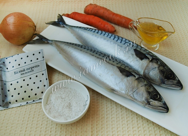Основное что нам понадобится это скумбрия свежемороженная, лук, морковь, растительное масло, белый молотый перец и соль.