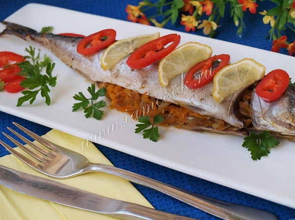 Готовую рыбу перекладываем на блюдо, украшаем и подаём. Очень вкусно и в горячем и в холодном виде. Скумбрия, запеченная с морковью и луком готова. Приятного аппетита!