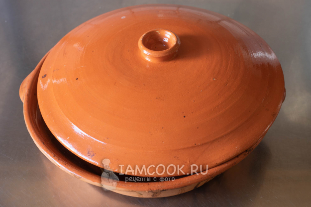 Общее время приготовления курицы в горшке - около трёх часов. Крышку горшка следует слегка сдвинуть. Горшок устанавливается в холодную духовку, после чего выбирается температурный режим 200°С. Три часа отсчитываются с момента включения духовки.