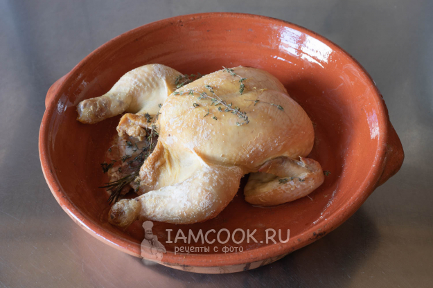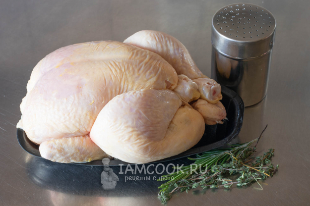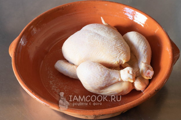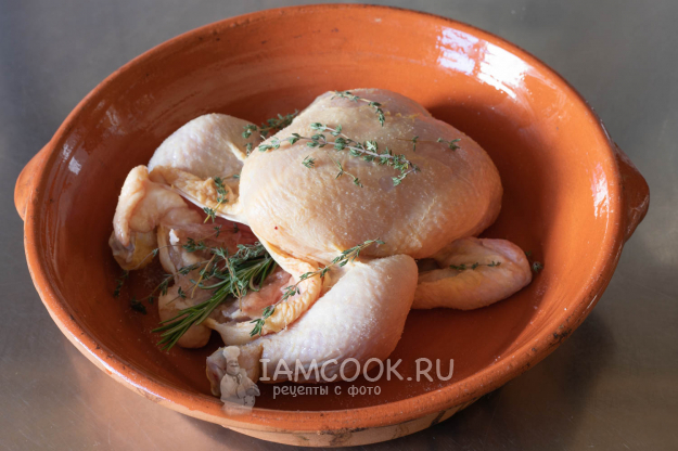 Перед началом приготовления курицы в горшке в духовке (целиком в одном горшке) мясо курицы должно иметь комнатную температуру. Набор приправ абсолютно произволен.