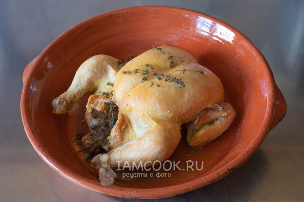 Мясо готовой курицы, приготовленной в духовке в горшке целиком, - белое, а не розовое. Сама она - значительно бледнее, чем при приготовлении открытым способом, коричневой корочки дожидаться бессмысленно.
