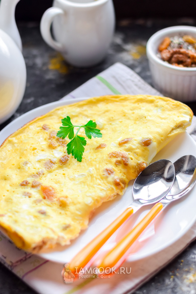 Жарить омлет с творогом и изюмом 5-6 минут под крышкой, на умеренном огне. Готовый омлет подавать к столу.