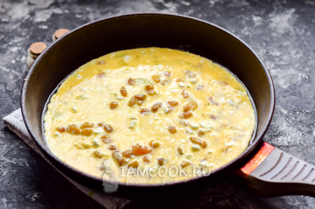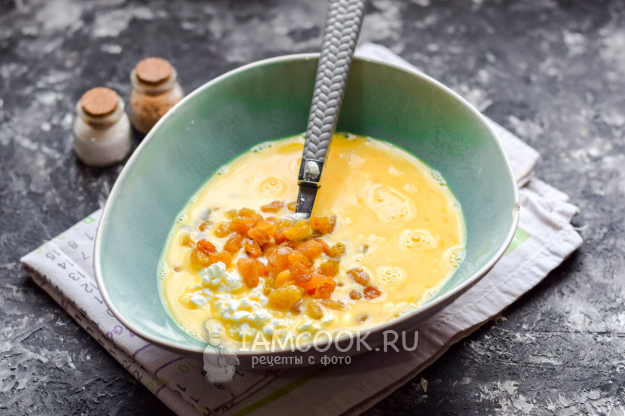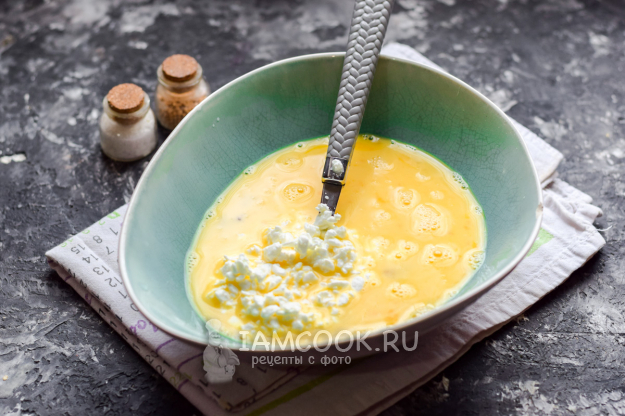 Добавить сразу в яичную смесь творог.