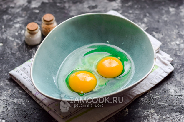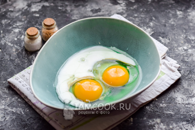 Взять глубокую миску, вбить в нее несколько крупных куриных яиц.