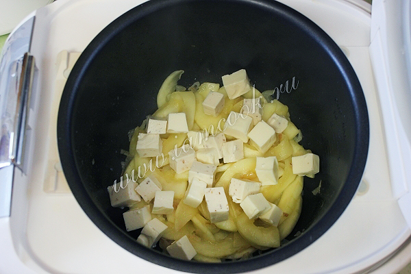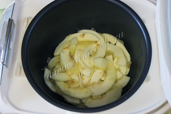 В мультиварке на режиме "жарка" или "выпечка" на оливковом масле сначала обжарьте нашинкованный лук, а затем к нему добавьте кабачок. Жарьте все вместе, пока дольки кабачка не станут мягкими, это примерно минут 10-15.