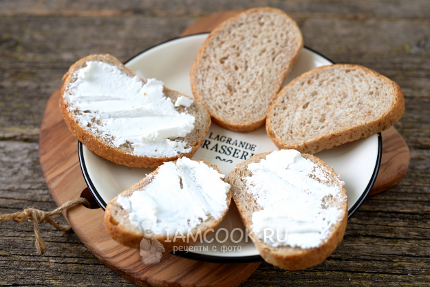 Ломти хлеба смажьте тонким слоем сливочного сыра.