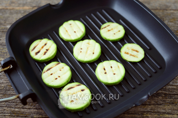 Нарежьте кабачок тонкими кружочками, толщиной до 0,5 мм, обжарьте его на раскаленной сковороде-гриль до легких подпалин.