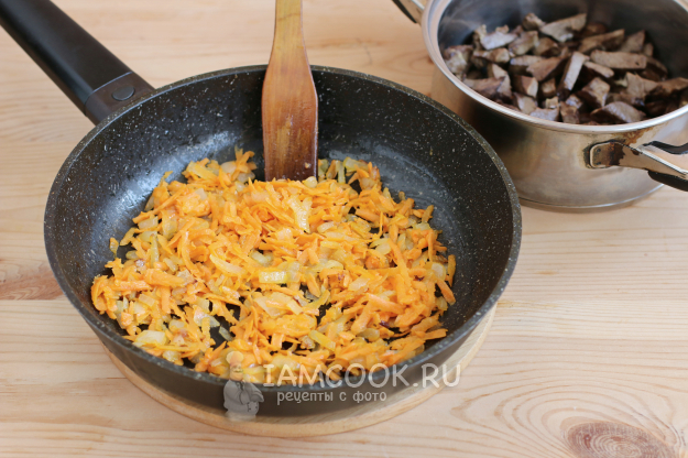 Обжаренное сердце переложим в кастрюлю, а в сковороде обжарим лук с морковью до мягкости.
