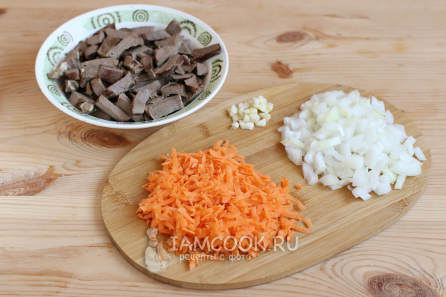 Отваренное сердце остудим и нарежем небольшими брусочками. Подготовим овощи - нарежем очищенную луковицу кубиком, натрем на крупной терке морковь, измельчим зубчик чеснока.
