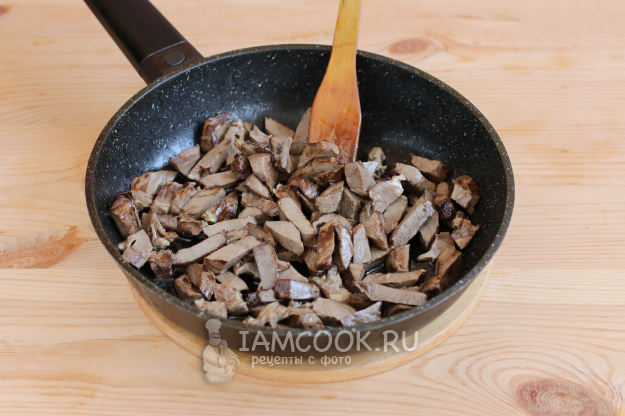 Обжарим кусочки говяжьего сердца на растительном масле около двух минут, помешивая лопаткой.