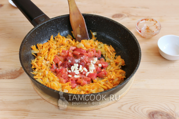 Затем добавим очищенный от шкурки и нарезанный кубиком помидор, томатную пасту, сахар и чеснок. Перемешаем и обжарим все вместе еще минуту.