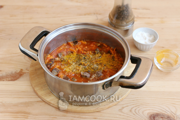 После переложим овощную смесь в кастрюлю к сердцу, добавим теплой воды, чтобы она покрыла содержимое, всыплем приправы, а также соль по вкусу и перец. Поставим кастрюлю на огонь, доведем до кипения и будем готовить на маленьком огне 15-20 минут. Так как сердце предварительно отварено, этого времени вполне достаточно.