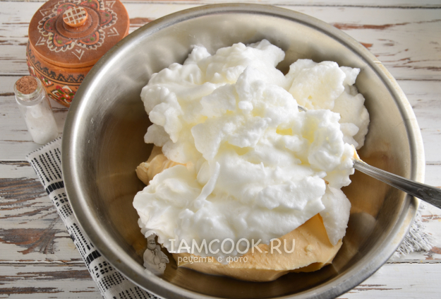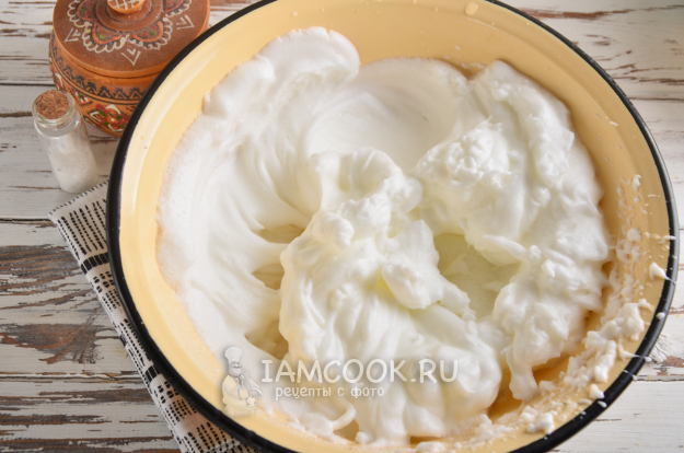 Яичные белки нужно взбить в миске со щепоткой соли. Важно добиться вот такой пышной структуры. Удобно использовать механический венчик или миксер.