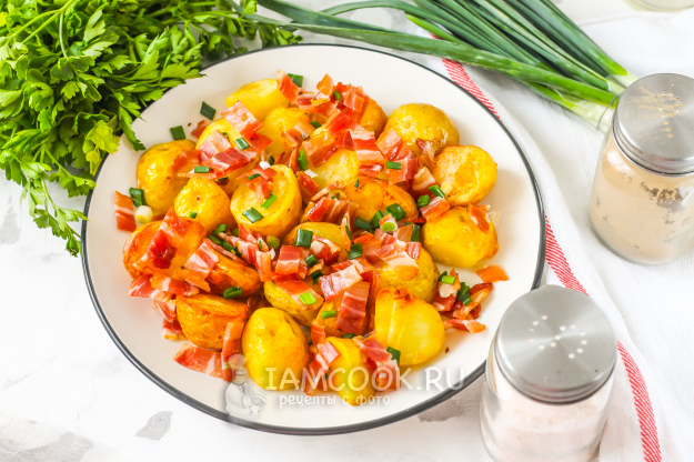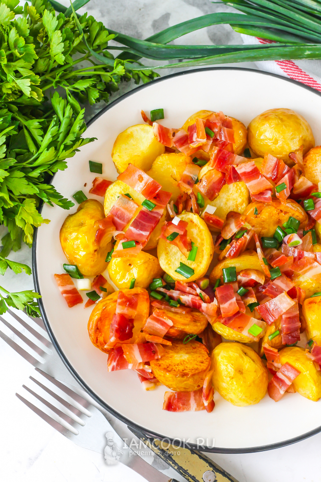 Выложите шумовкой поджаренный молодой картофель сначала на бумажную салфетку, чтобы она впитала лишний жир, затем на блюдо или тарелку, сразу же присолите. Присыпьте картофель измельченным беконом и зеленым луком.