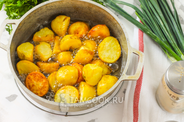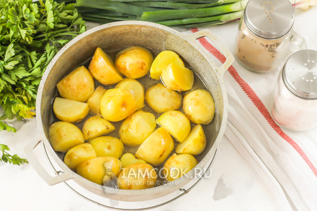 Молодой картофель тщательно промойте в воде жесткой стороной губки - она удалит всю нежную кожуру с корнеплодов. Приобретайте средний или мелкий картофель, чтобы его можно было быстро прожарить. Клубни нарежьте пополам или на четыре части. Прогрейте растительное масло в казане или кастрюле с антипригарным покрытием. Всыпьте туда картофельную нарезку.