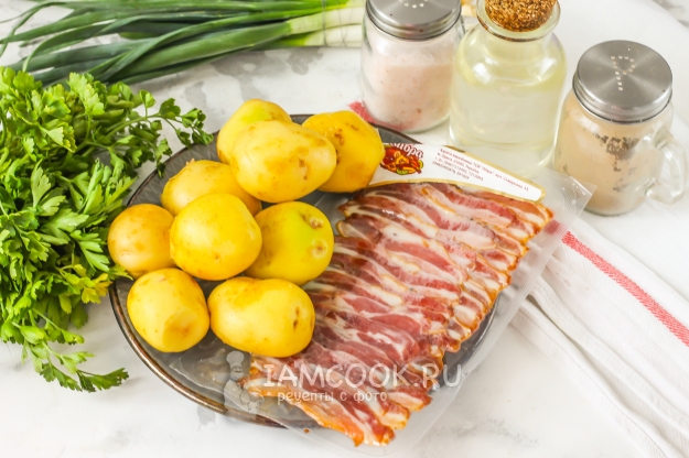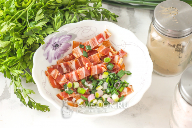 В это время копченый бекон нарежьте кубиками или брусочками, высыпьте в пиалу или миску. Промойте стебли зеленого лука и измельчите, добавьте к нарезанному бекону и перемешайте. Если у вас в наличии свежий бекон, то слегка его поджарьте, а потом нарежьте.