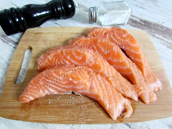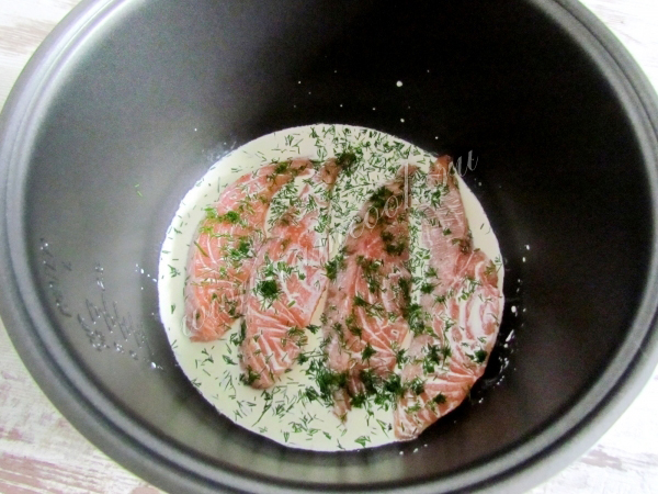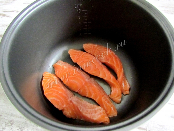 В чашу мультиварки положите куски семги. Чашу смазывать растительным маслом не нужно.