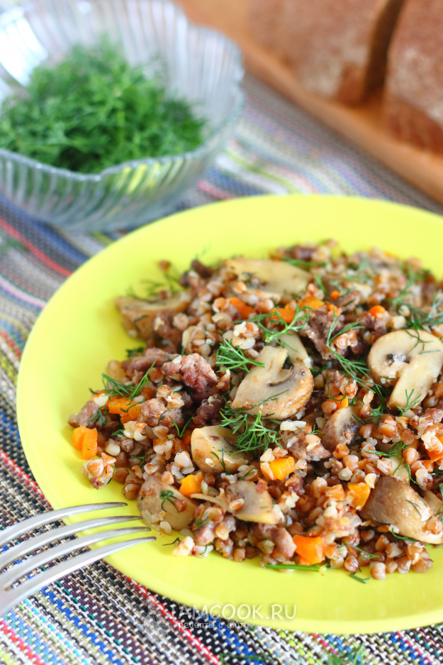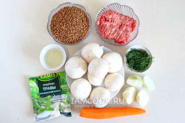 Для приготовления гречки с фаршем и грибами в мультиварке нам потребуются следующие компоненты.
