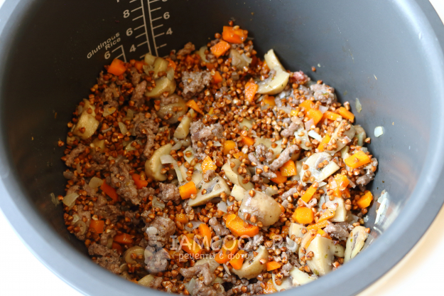 Гречку промываем и отправляем к остальным ингредиентам. Перемешиваем и прогреваем 3-5 минут, чтобы крупа впитала все соки мяса, грибов и овощей.