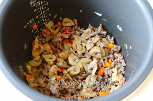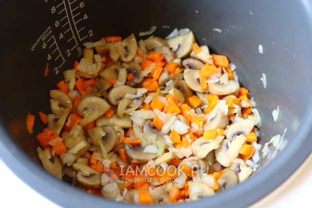 Закидываем овощи в чашу к грибам, вливаем масло и обжариваем под крышкой 5-7 минут.
