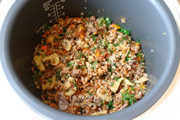 Перемешиваем и настаиваем гречку с фаршем и грибами в мультиварке под крышкой ещё минут 5-10.