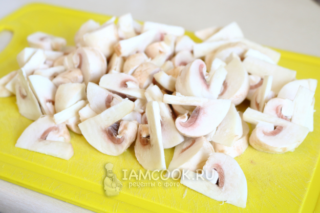 Шампиньоны промываем. Очищаем по желанию - например, если они потемнели. Нарезаем средними кубиками. У меня грибы большие, я разрезаю каждый на 8 частей.