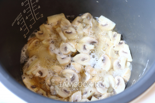 Мультиварку устанавливаем в режим «Выпечка» и закидываем грибы. Тушим с открытой крышкой до выкипания жидкости. Это займёт минут 20.