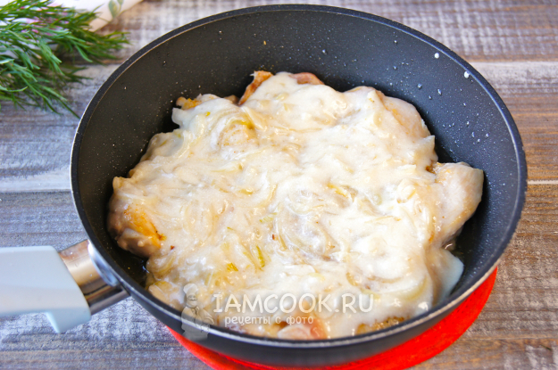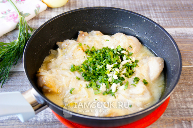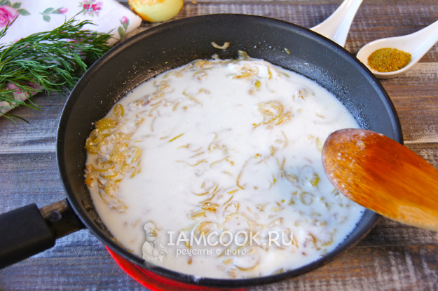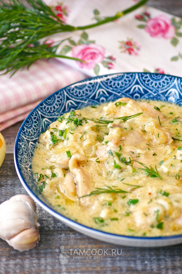 Залейте луково-молочной смесью курицу, накройте крышкой и томите около 25 минут.