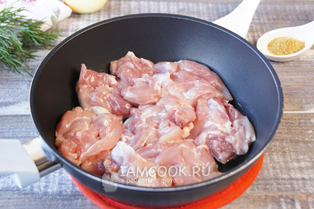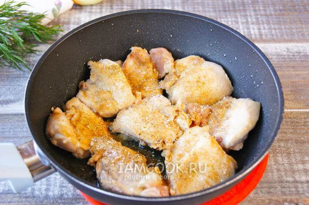 Филе куриного бедра промойте, обсушите и выложите на раскаленную сковороду с растительным маслом.