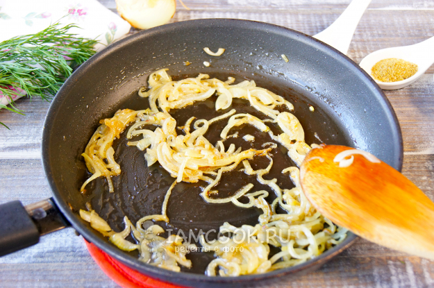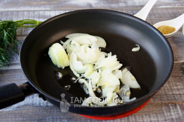 Разогрейте сковороду с растительным маслом, обжарьте лук, нарезанный полукольцами, до румяности.