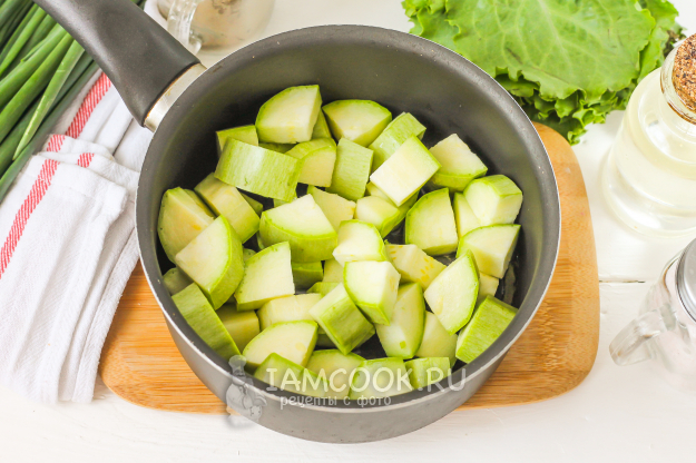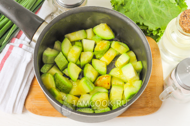 С кабачков срежьте хвостики, промойте овощи в воде. Нарежьте каждый из них шайбами толщиной в 1 см, затем каждую шайбу разрежьте на четыре части. Прогрейте растительное масло в казане или ковше с антипригарным дном, сотейнике и выложите в емкость кабачковую нарезку. Обжаривайте примерно 5-6 минут, время от времени перемешивая. В процессе обжаривания нарезка выпустит сок.