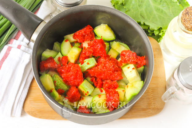 Выложите в емкость пасту из болгарского перца. Аккуратно перемешайте и томите на умеренном нагреве примерно 3-4 минуты, пока кабачки не окутаются этим ярким ароматом.