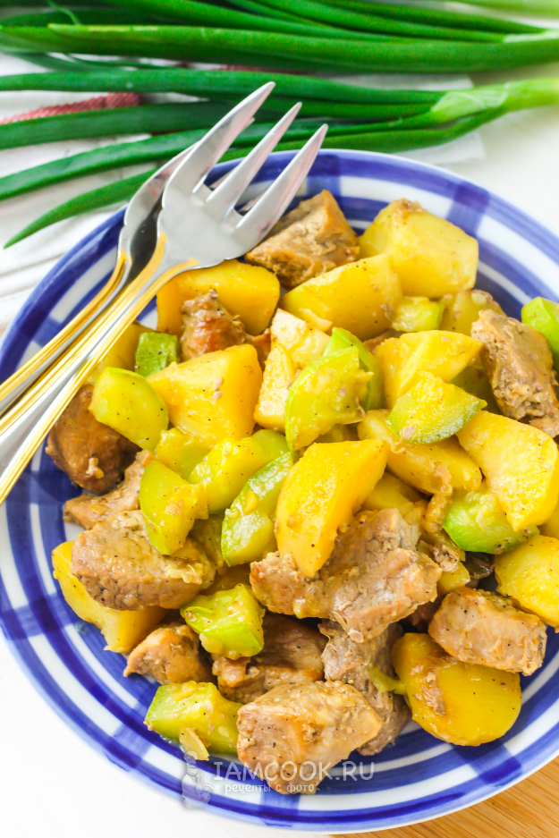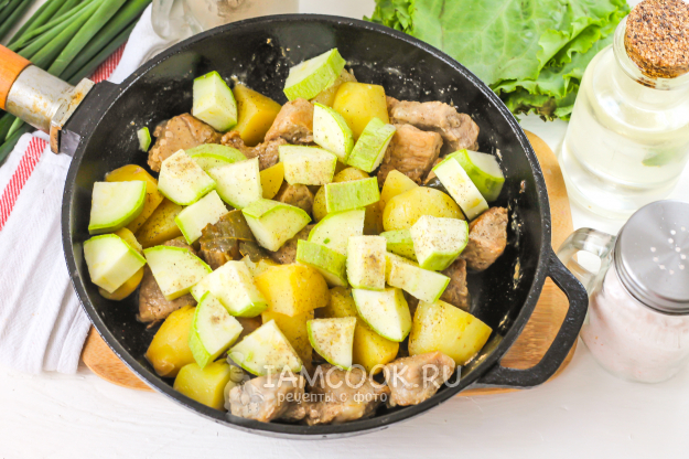 Промойте кабачок и срежьте хвостики. Нарежьте порционными кубиками, ломтиками и добавьте в емкость. Влейте 50 мл теплой воды. Поперчите блюдо и накройте емкость крышкой. Тушите рагу примерно 15 минут - до мягкости картофеля.