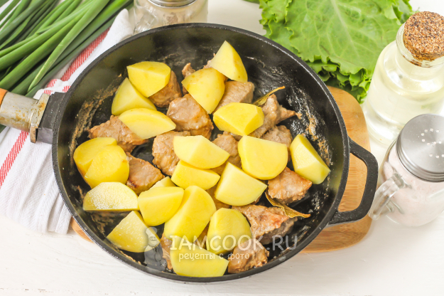 Очистите молодой картофель, промойте и разрежьте на четыре части каждый плод. Добавьте на сковороду и поджарьте с мясом около 2-3 минут.