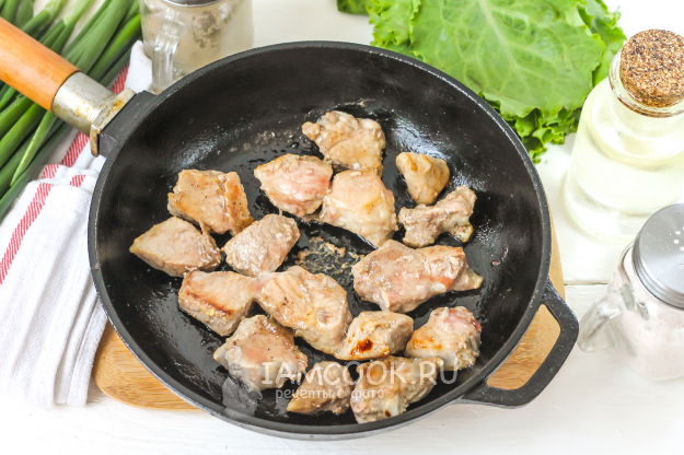 Промойте мясо в воде, зачистите его от жил и пленок, разрежьте на порционные ломтики. Прогрейте сковороду с растительным маслом и обжарьте в нем кусочки мяса примерно 5-6 минут - до румяности.